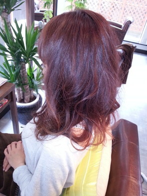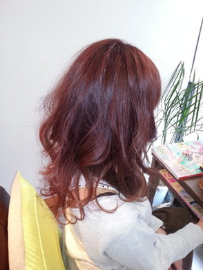 32ミリのコテで毛先からランダムに巻、表面の毛を少しつまんでふわふわ感を強調。